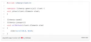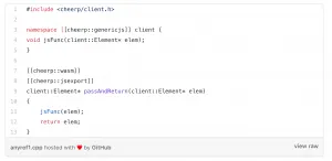 This allows Cheerp to compile C++ code to regular JavaScript, and interoperate easily with JavaScript libraries (including the native browser APIs). It is also possible to mix and match these two representations and choose one or the other for any declared struct/class.