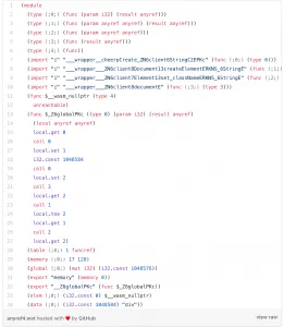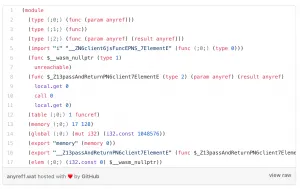 The resulting wat file. You can see the anyref types in the function signature